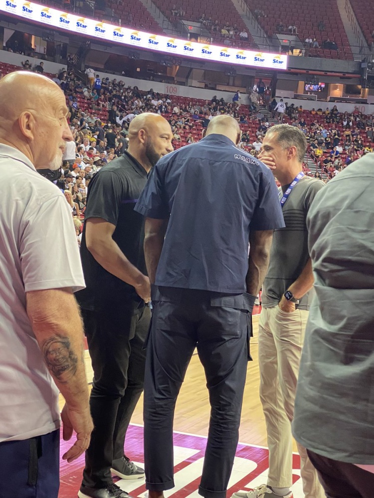 直播吧7月9日讯今日湖人VS太阳的夏季联赛正在进行中,湖人球星詹姆斯,威少,总经理佩林卡,主教练哈姆均现身球馆观战。NBA记者DaveMcMenamin晒出了一张佩林卡哈姆詹姆斯聊天的图片,该场景出现
