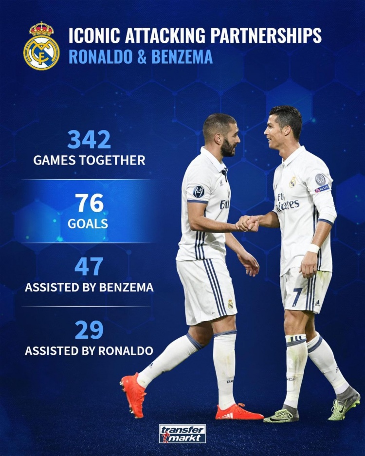 本泽马C罗:一起出场342次 合作进球一共76球 本泽马助攻47次 C罗助攻29次