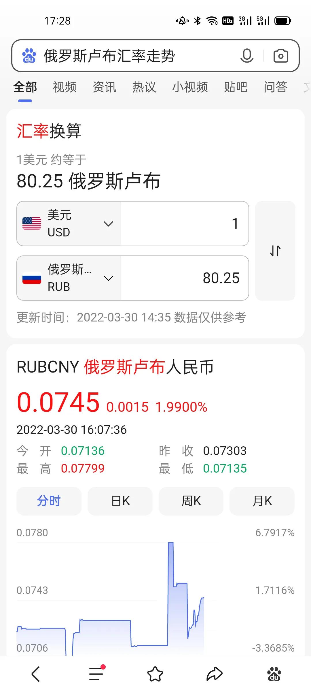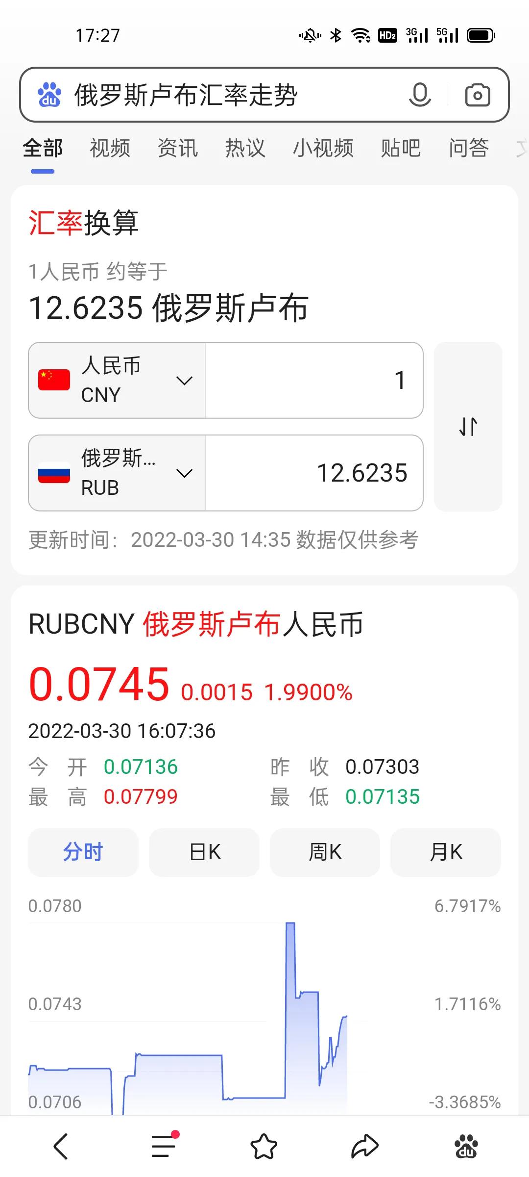 这个是最新的汇率兑换,1人民币兑换12.6235卢布。百度时间是2022年3月30号的汇率