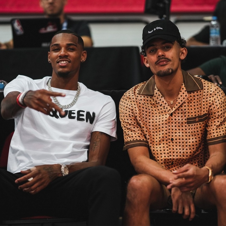 特雷-杨和他的新帮手德章泰-穆雷一同在现场观战本场比赛,两人并排坐,有说有笑。