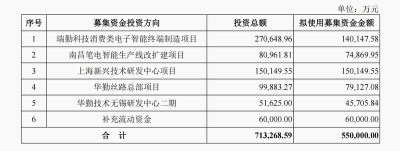 此次转投上交所主板,华勤技术的募资总金额也由75亿元缩水至55亿元,缩水幅度约达到26.27%,具体募投项目没有变化但调低了部分项目使用募资金额。