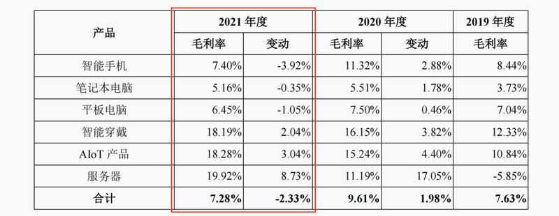 而主要扮演代工厂角色的华勤技术业务毛利率并不高,报告期各期分别为7.63%、9.61%和7.28%,2021年由于贡献主要收入的智能手机、笔记本电脑和平板电脑业务利润率均有不同程度的下降,公司整体毛利率也出现起伏波动。![]()