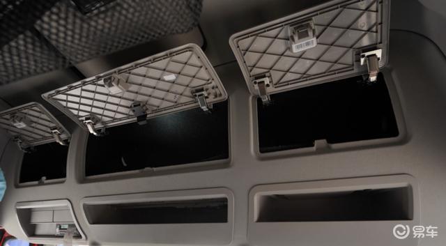 车内储物空间部分,高顶驾驶室的顶部空间非常宽裕,可以放一些被褥、衣物等大件物品。底部开放式的储物格外侧栏板比较高,可以防止车辆行驶过程中里面的物品滑落,可见设计细心。