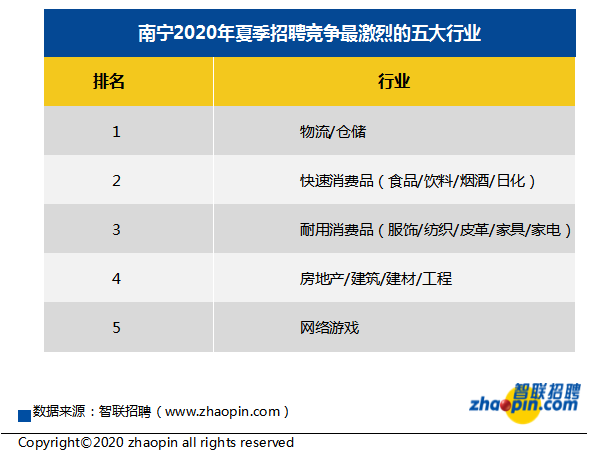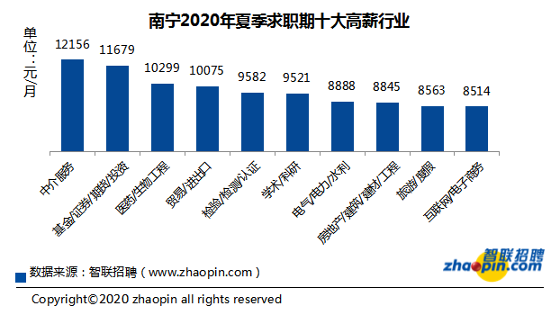 南宁云—南宁新闻网讯(记者 李琴 通讯员 覃冬冬)日前,智联招聘发布《2020年夏季南宁雇主需求与白领人才供给报告》,南宁地区2020年夏季求职期的平均薪酬为8054元/月,十大高薪行业中,中介服务行业的平均月薪最高,为12156元/月。