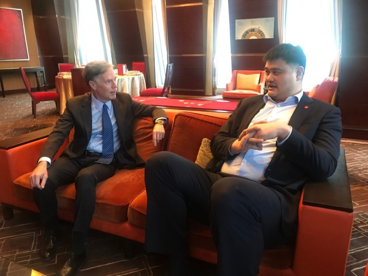 直播吧7月13日讯中国篮球协会官方报道,中国篮协主席姚明日前与美国驻华大使尼古拉斯-伯恩斯进行了交流。原文写道:体育是友好交流的桥梁。中国篮协主席姚明日前应邀与美国驻华大使尼古拉斯-伯恩斯会面,双方围