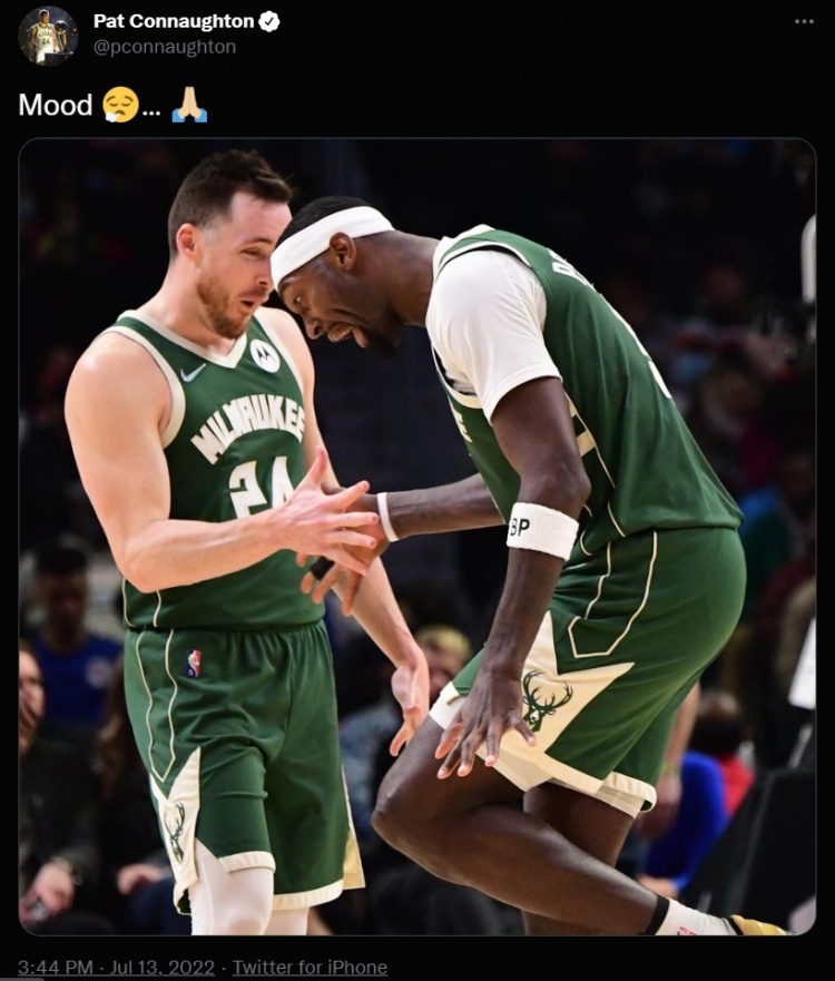直播吧7月13日讯据此前报道,雄鹿后卫康诺顿与球队达成了一份3年2850万美元的提前续约合同,其中最后一年为球员选项。康诺顿在个人社媒晒出了与队友波蒂斯的照片,并配文到:心情由