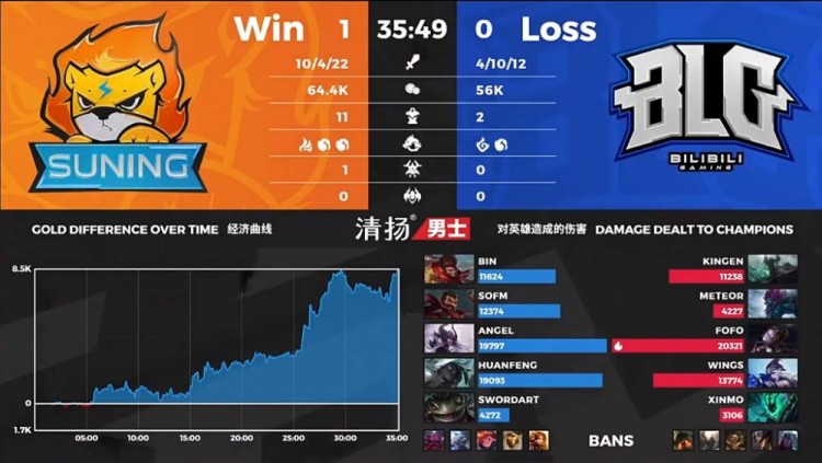 【34:30】SN主动大龙逼团随后强开BLG,将锤石击杀;两边拉扯到中路开团,铁男、寒冰相继倒地,SN强拆一波结束比赛。