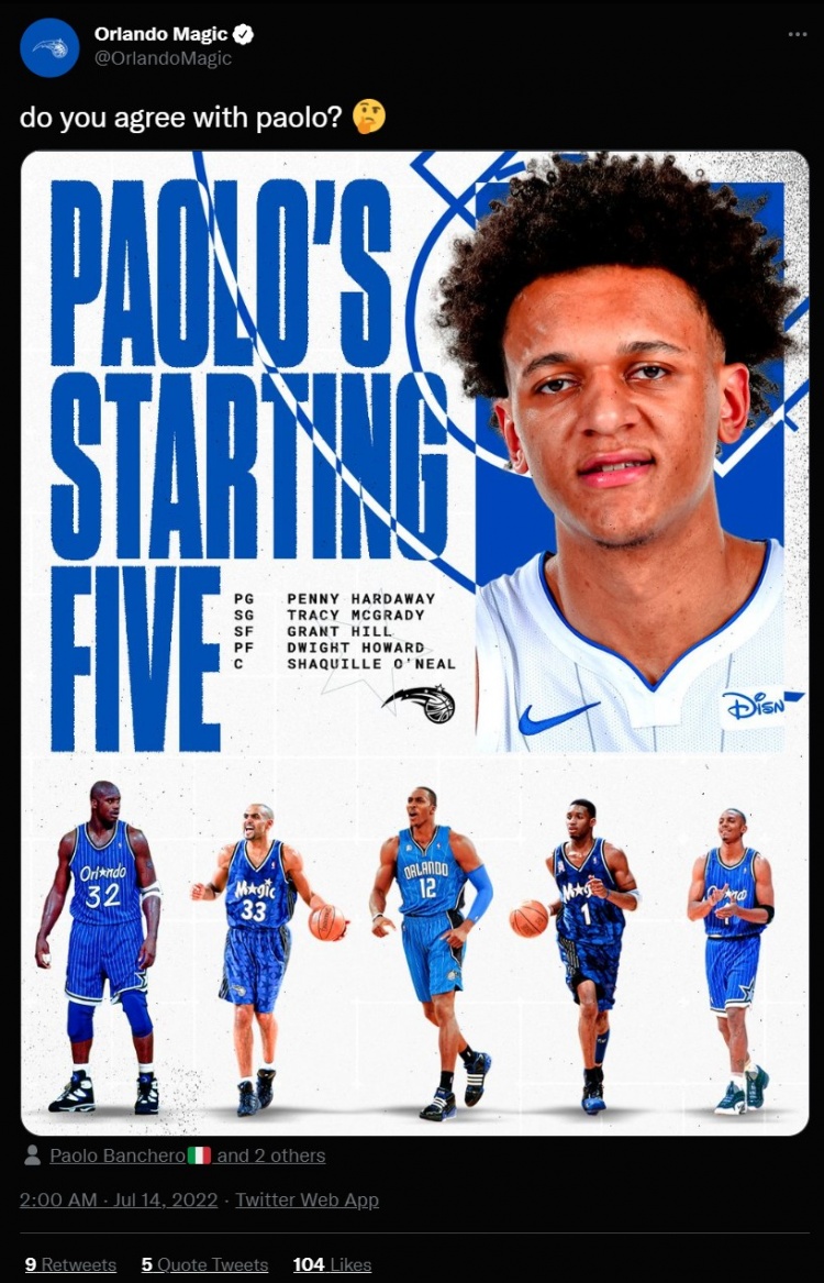 直播吧7月14日讯 今日,魔术官推晒出了状元秀班凯罗评选的队史首发五虎。