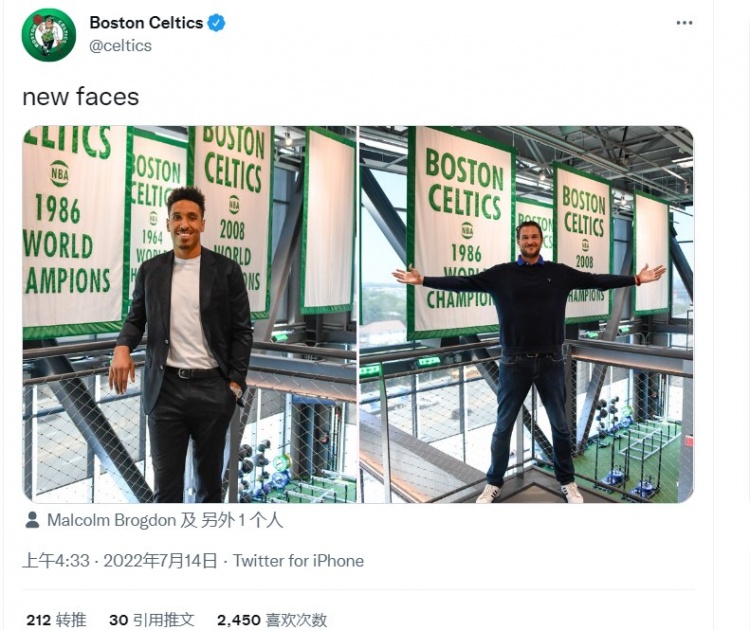 直播吧7月14日讯 凯尔特人官推今日晒出两位新援布罗格登和加里纳利在球队训练场的照片。