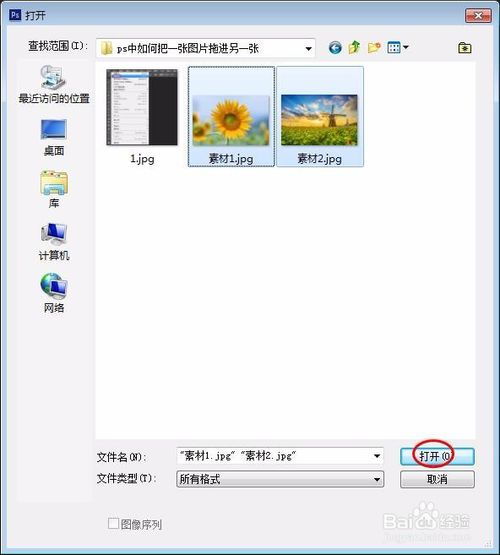 请问ps怎么把一张图放到另一张图片上?1.点击左上角的文件,点击打开并放入需要融合的图片。