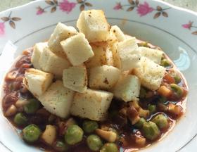 5、平底锅放适量的油,烧热,下馒头丁,。