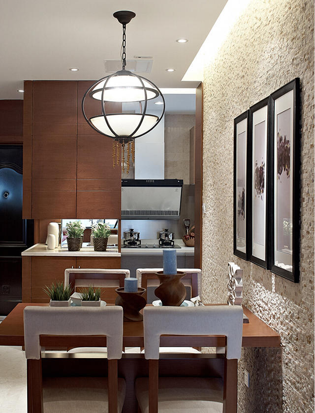 一体化的餐厅很符合当前流行家装的趋势,不设计独立餐厅或者隔断去影响室内采光和通透性。餐边柜的设计可以有效的保证室内的储物要求,特别是墙面的镜面设计更加为室内的通透性和扩大了视觉感官。