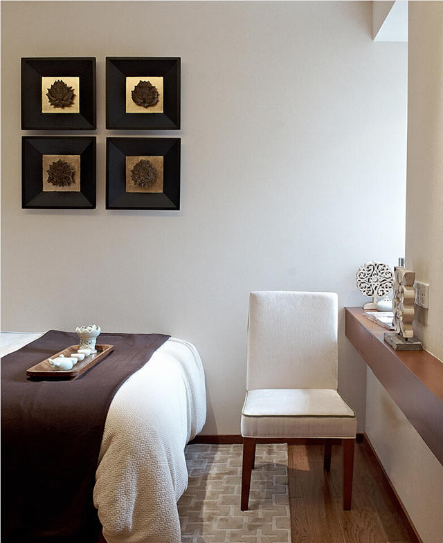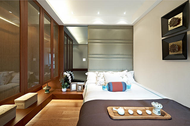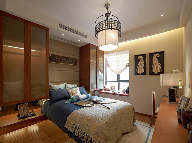 相比较而言,次卧的面积比主卧小了很多,但是次卧整体的氛围更加符合中式的传统文化,同时将现代元素和传统元素结合在一起,以现代人的审美需求来打造富有传统韵味的事物,让传统艺术在当今社会得到合适的体现。