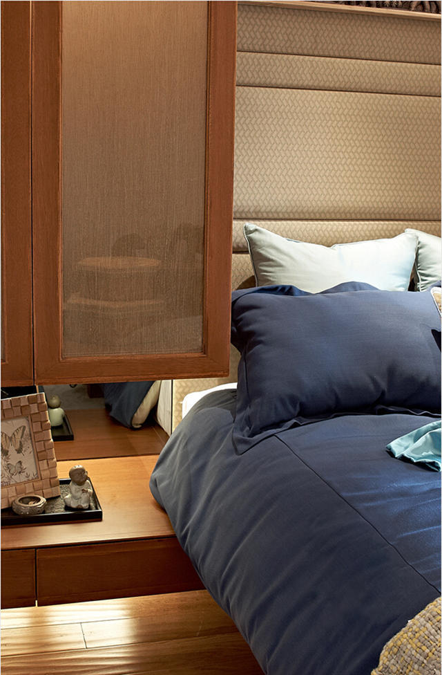 卧室内整体选用的是以木质材料居多,颜色多以仿花梨木和紫檀色为主。墙壁四白落地,配合深褐色家具的米白、米黄或沙色。让居室整体充满了灵动而自然的气息,装饰品的点缀也让室内凸显了高贵而华丽的格调。