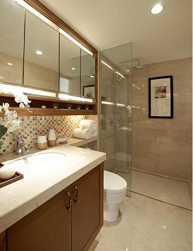 厕所的地砖和浴室墙面砖选择了较为温馨的色调,同时以不同颜色的家具进行混合搭配,整体给人耳目一新,清新自然的视觉感受。同时要注意,卫生间想要真正体现中式装修的韵味,需要从细节上下功夫。