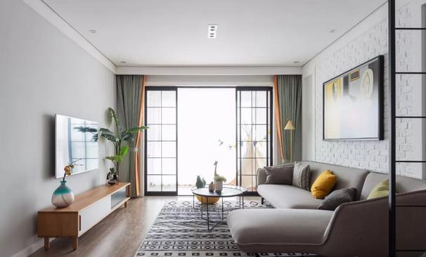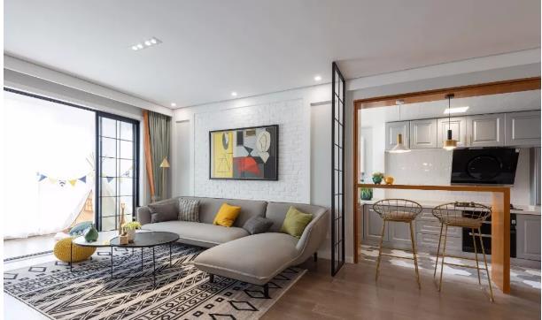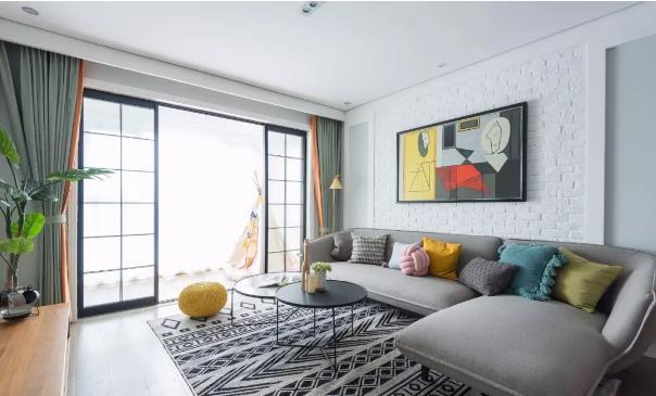 北欧风几何地毯搭配灰色沙发,白色文化砖打造的沙发背景,点缀抽象挂画,空间看上去很文艺范儿。