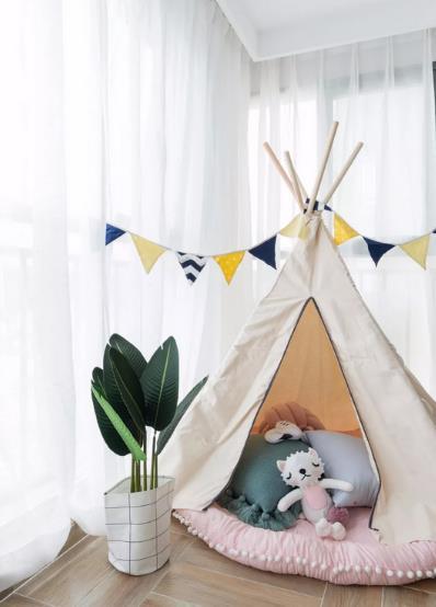阳台白色纱帘,一角放上儿童帐篷,温馨又舒适。