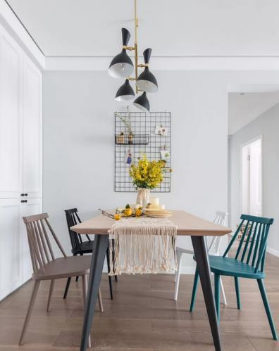不同色调的温莎椅和吊灯给餐厅增加了趣味性。