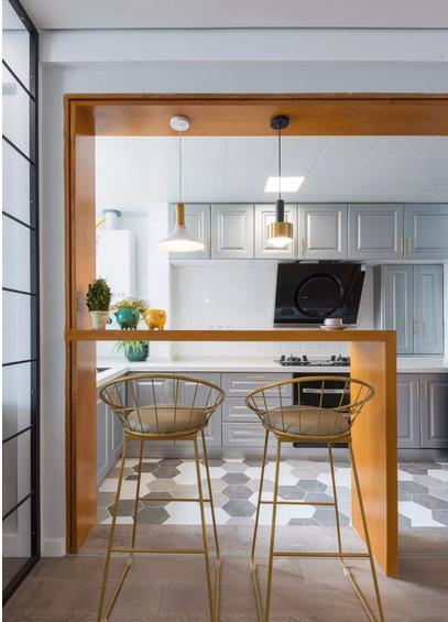 开放式厨房,用六边地砖铺贴,时尚个信息,亮黄色木色垭口设计成小吧台隔断。