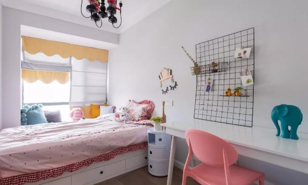 儿童房榻榻米增加收纳空间,浅灰色墙面搭配粉色、鹅黄软装,俏皮可爱。