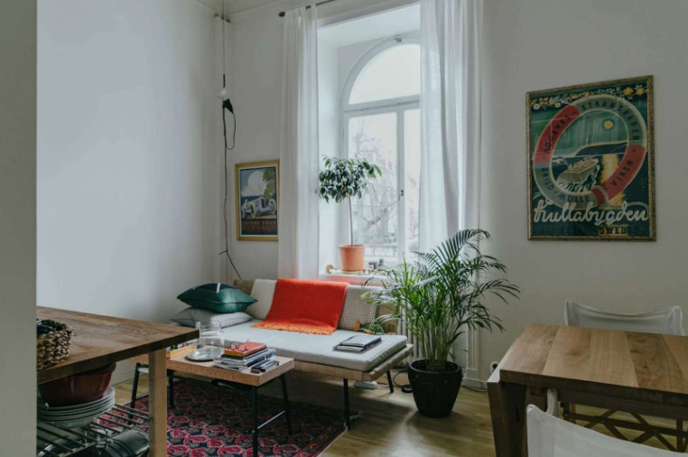 整体空间以白墙和木地板构筑纯净敞亮的基调,彩色抱枕、地毯以及针织品让空间生动了许多,将采光极佳的窗边区域让给客厅,显得小小的地方变得明朗宽敞起来。