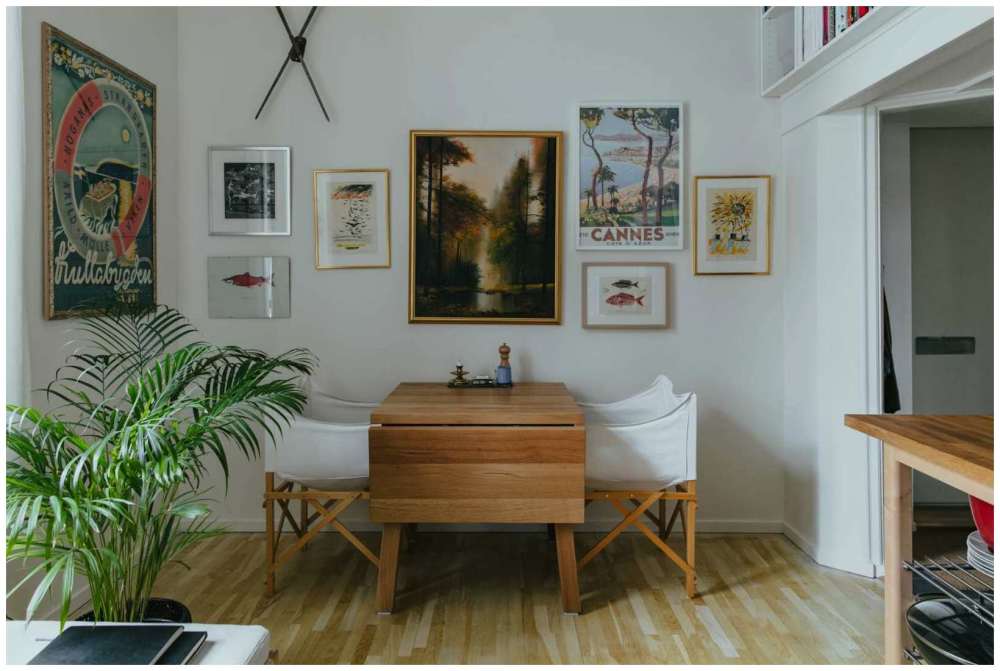 用餐区的背景墙以装饰画营造出优雅情调,可折叠的餐桌,让用餐空间能够得到灵活拓展。因为空间不大,就把电视放到了柜子里,这样别出心裁的想法,真的是非常有趣呢!