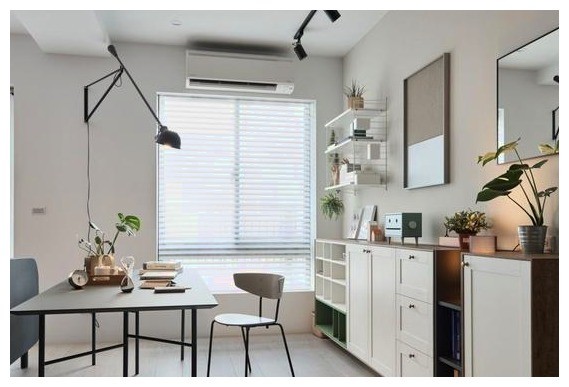 客厅后拍的书桌部分,灯光的设计是接顶的轨道上的四盏射灯以及能够移动的长颈书灯,整个家具和灯光的风格也是非常统一的,非常简洁的风格。