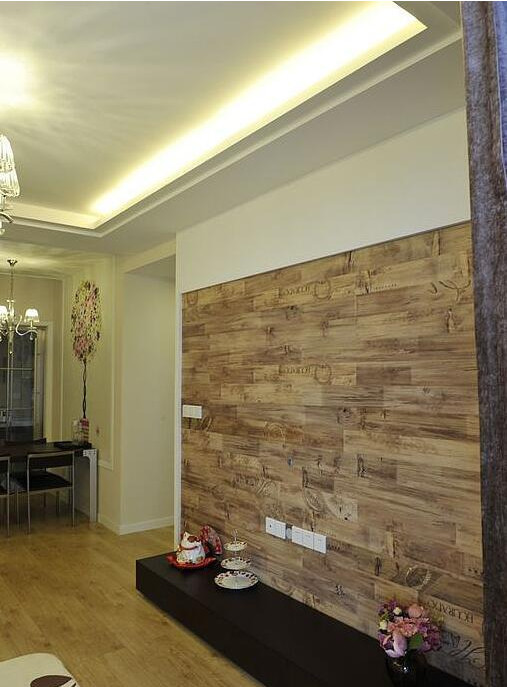 电视墙在刷大白的基础上,贴上了原木色的壁面木板,纹理很漂亮,色彩很自然。