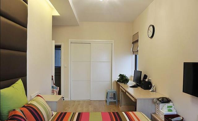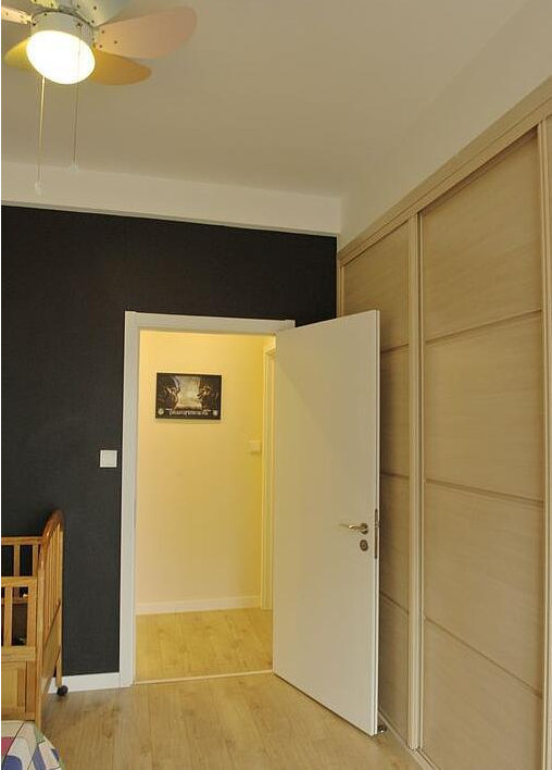 进入次卧,门框墙贴上了深的的墙纸,会吸收一些亮度。门后是内嵌式的推拉移门大衣柜,居然有空间,就要把衣柜做大一些,就不怕衣服收纳不下了。