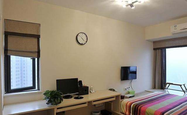 大床是直接从床头延伸到床尾的,比较长,墙面挂上一台电视,睡前看看电视,能更好入睡,谁的更香,边上就是飘窗,在床上就可以直接看到外面的风景,视野开阔。