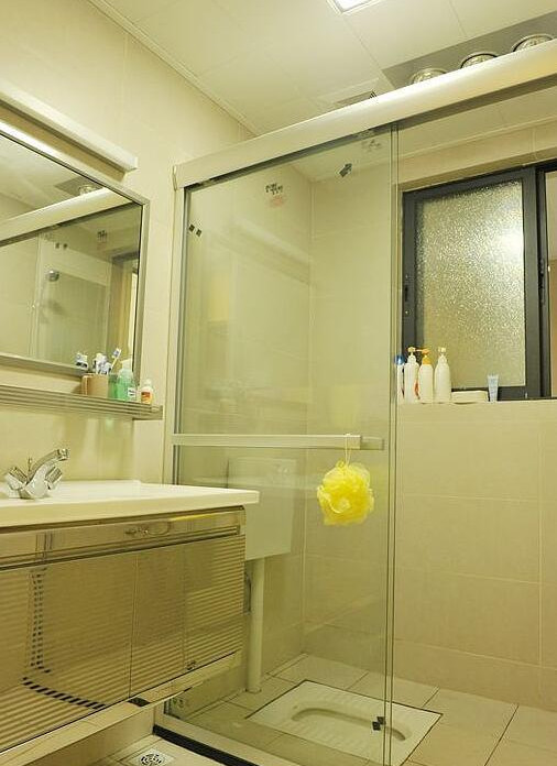 这是客卫生间,空间是比较紧凑的,为了能更宽敞一些,就把蹲坑一起布置在淋浴区里面,这样淋浴区和洗手台区域就更宽敞,淋浴都更舒服。