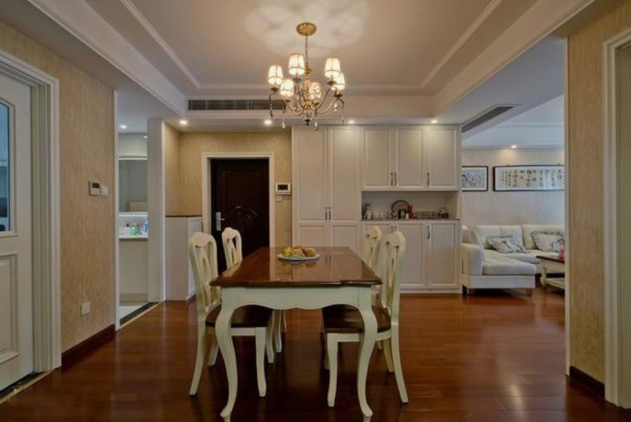 入户对餐厅,靠墙是鞋柜,整个孔家弄得感觉就是很大气自然的,并且也是有一部分欧式装修的淡雅的风格,感觉还是很舒服的。新家吊顶内置新风系统,也是很不错的一个家电。