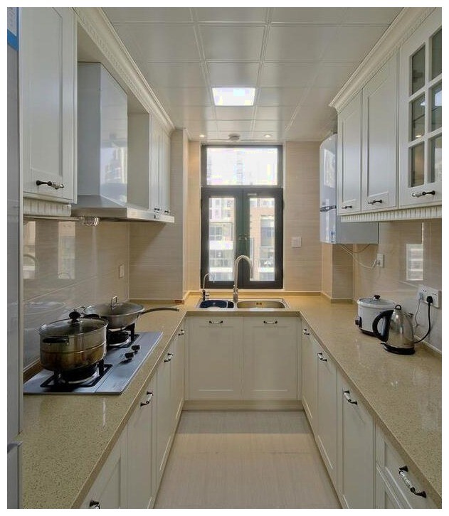 厨房的设计是很对称的,感觉整个空间也是很宽敞舒服,白色的柜子不仅干净还感觉非常清爽自在,使用起来也是非常方便顺手的。