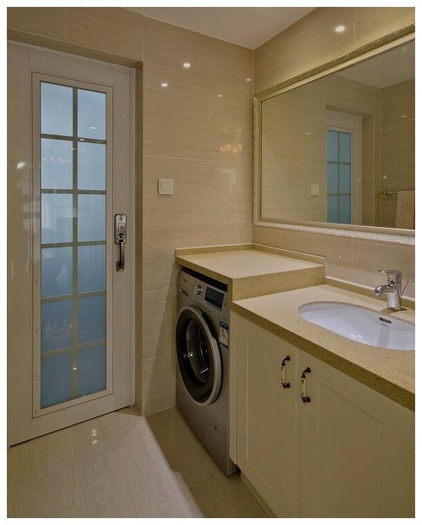 卫生间,留了一个洗衣机位置的台盆,就能够很方便地洗衣服了,整个空间的利用度也是很好的,感觉自己虽然家里装修的成本只用了15万,但是效果感觉像是30万块钱的装修效果的,不仅质量,美观度也是很好的。