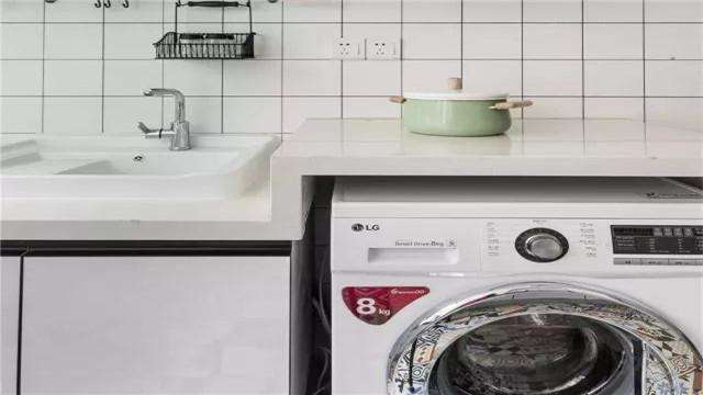 还有一点要提醒,如果想在橱柜内放洗衣机,台面的高度就一定要慎重考虑。滚筒洗衣机的高度一般为82cm或86cm左右,假设台面4cm,总高度就为86—90cm,可以采取局部柜体加高的办法来解决。