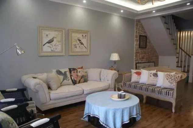这边是客厅,比较简单清新的风格,茶几选了圆形的,更加贴近美式的风格。