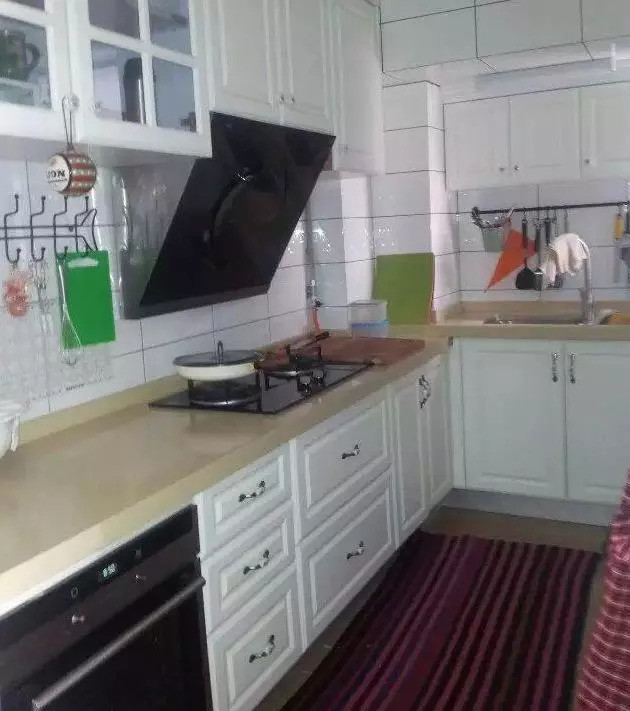 这是厨房,上下都打了满满的柜子,白色橱柜,米黄色的台面,干净整洁。