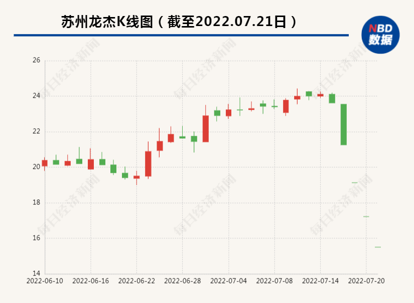 7月21日, 苏州龙杰(SH603332)继续被“一字”跌停按倒在地板上,截至发稿,苏州龙杰报15.50元/股,跌幅9.99%,总市值为25.81亿元。