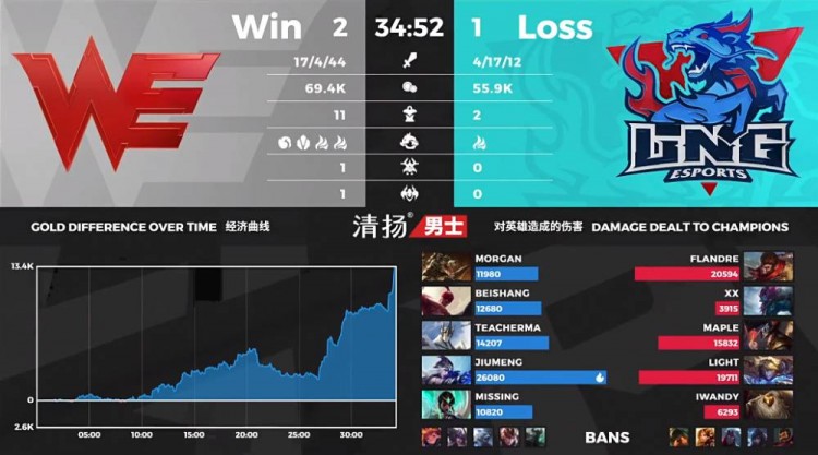 【34:15】WE稳稳控下远古龙,随后反打野区的LNG人员,一波追击战团灭LNG后结束比赛。