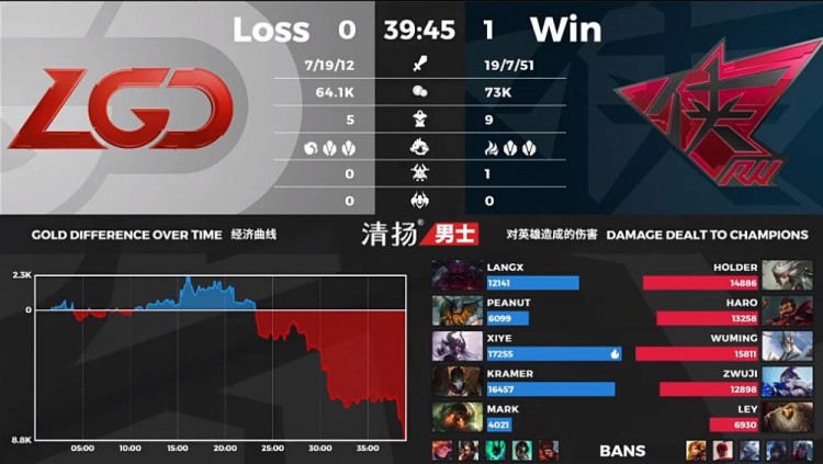 【38:50】中路依然是RW抓到机会强开,虽然寒冰被击杀但是RW收拾残局一波击杀四人后,RW直接结束了比赛。