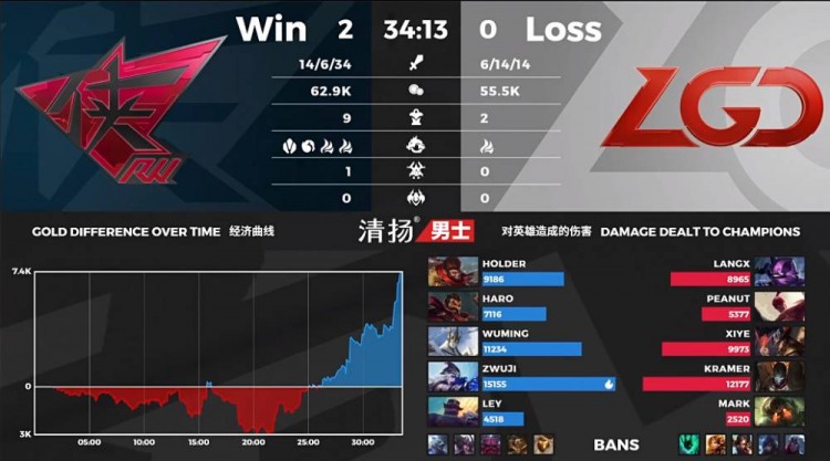 【15:35】RW动手先锋但是LGD前来,RW果断反开先将泰坦收掉,进场的凯南被套上虚弱后也被RW击杀;随后上路清线的烬被男枪完成单杀后,RW稳稳控下先锋;