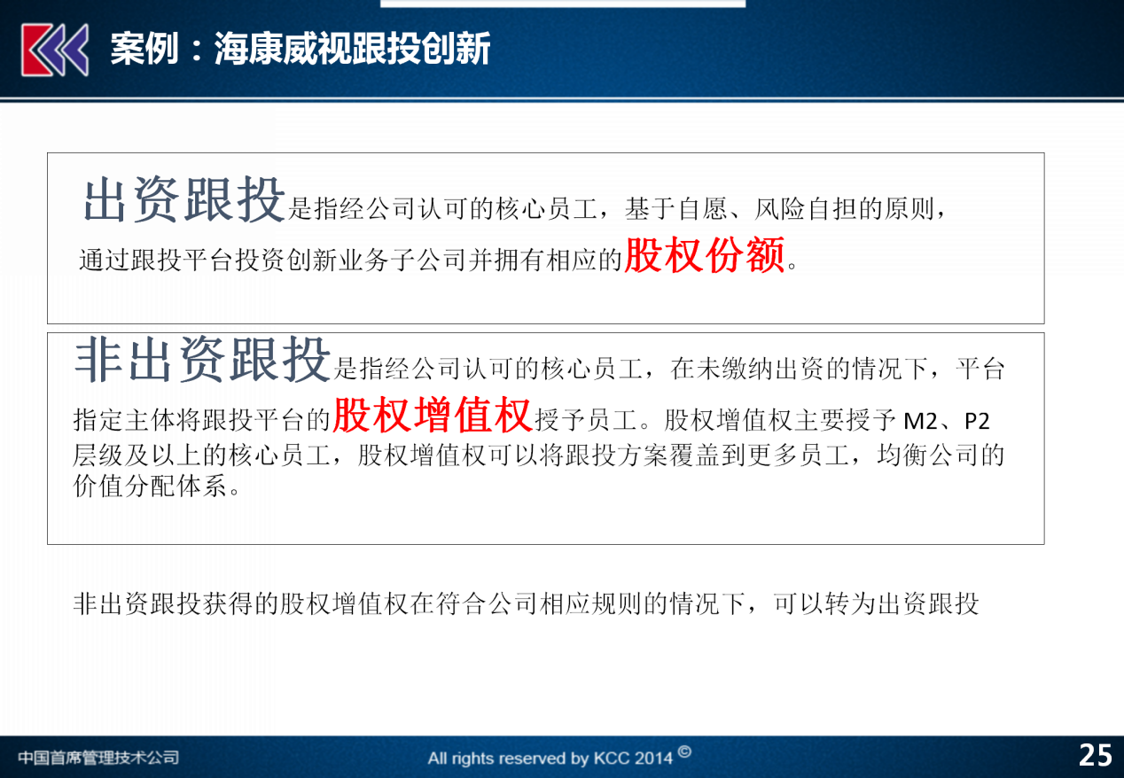 出资双选。有些时候或者大部分时候跟投的人,为了实现自己激励约束对等的目标,都得需要掏钱,拿出自己的血汗钱,看家的压箱底的老本,和我们其他的股东,包括国有的资本一起来注入到这个事业当中,才有可能风险绑定,这是必须的。但是也有一些情况是,参与跟投的人或者必须跟投的人,有可能暂时拿不出钱,但这些人又特别重要怎么办,海康威视提了一个叫做非出资跟投。
