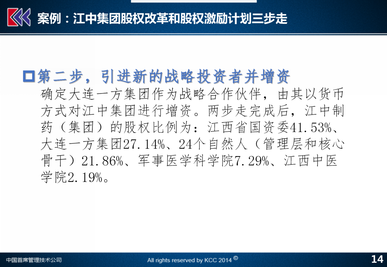 第二步,在公开的产权市场上进行战略投资人的引入,就像现在做股权多元化做混改一样,引入了大连一方集团作为战略投资者和合作伙伴,实现了公司的进一步的股权多元化。那么,在这个进一步的股权多元化之后,江西省国资委的持股比例从100%降到了41.53%,大连一方集团占了不到30%,24个自然人占公司21.86%的实股,以及军事医学科学院这样的公司战略投资人,整个这样一个股权结构形成了。