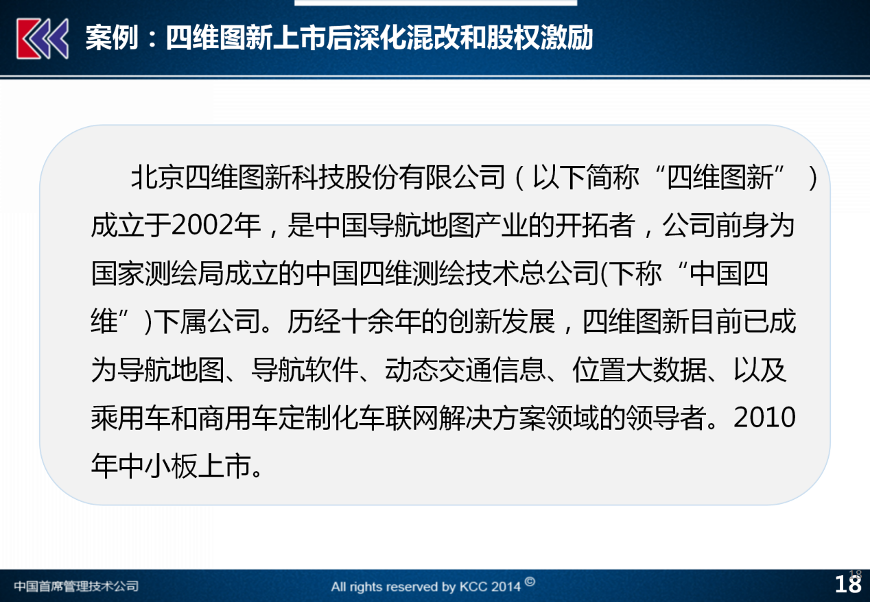 这个例子来自于航天系统,有一家公司大家都比较熟悉,这家公司是做遥感测绘,就是我们所谓的卫星导航地图产业的,这家公司叫做四维图新。四维图新这家公司,2010年在深圳的中小板上市,那么过去这两年,其实他在长期激励和混合所有制改革这个方面,在这样一个系统里面其实做的还是非常有代表性。