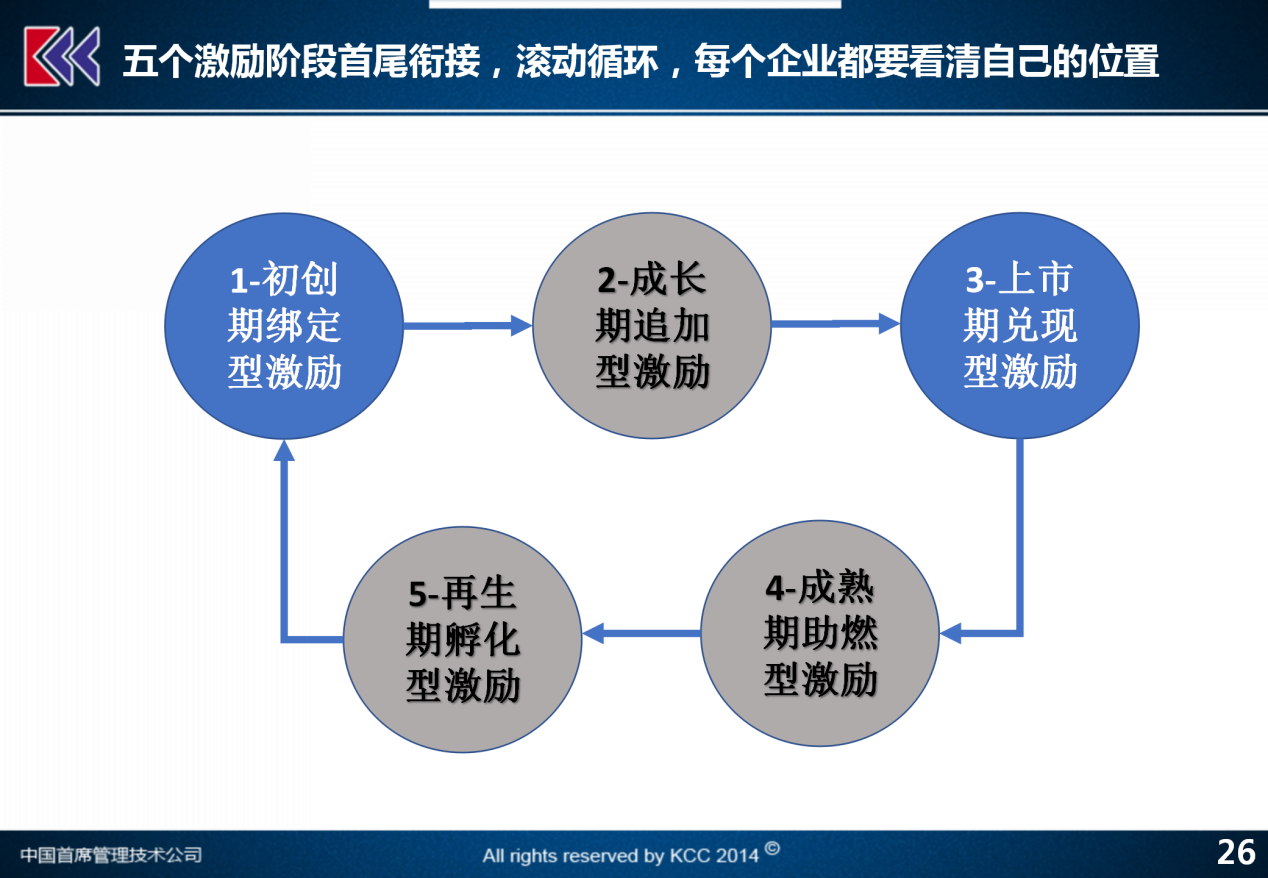 那么这五个阶段再说一遍,初创期绑定型激励、成长期追加型激励、上市期兑现型激励、成熟期助燃型激励,再生期孵化型激励。在实际的操作过程当中,希望大家能够根据自己的情况,结合这些案例深入的思考来做相关的工作。