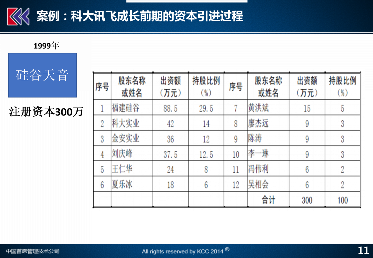 科大讯飞成立的时候是1999年,它的注册资本是多少?只有三百万。那么,在科大讯飞跟它的前身硅谷天音这家公司里面,大家可以看到当时注册时候的股权结构,实际上代表国有股的所谓科大实业,在注册的时候持股比例只有14%。那么其它的包括刘庆峰先生,王仁华这两位董事长和总经理,他们两个人的持股比例加起来是20.5%,还有其它的人都是实名制的最核心的创业股东。公司注册资本只有三百万,所以说每个人掏的钱都不多每个人只出了几十万二三十万,还有一些核心人员的钱更少,他只出了几万块钱他就能占到2%-3%的股权比例。我觉得对于一个知识创造型的技术公司来说,这一点是比较重要。