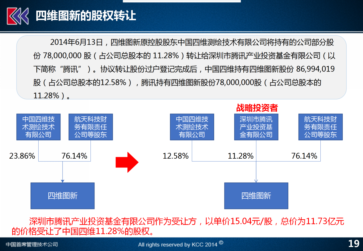 简单来说,2014年的6月份四维图新,他原来有个大股东持有23.86%的股权,这个大股东叫中国四维技术测绘技术有限公司,他通过大宗上市公司股权大宗转让的形式,把23.86%中11.28%的股权通过寻找投资人的方式,协议转让给了战略投资人腾讯产业投资基金,实际上把原先国有控股的上市公司的国有股比下降,同时引进了一个在IT领域非常厉害的世界级企业腾讯来做战略投资人,形成了一个崭新的股东的结构,拼接了新的资源,奠定了新的发展基础。