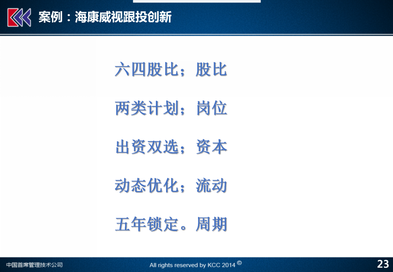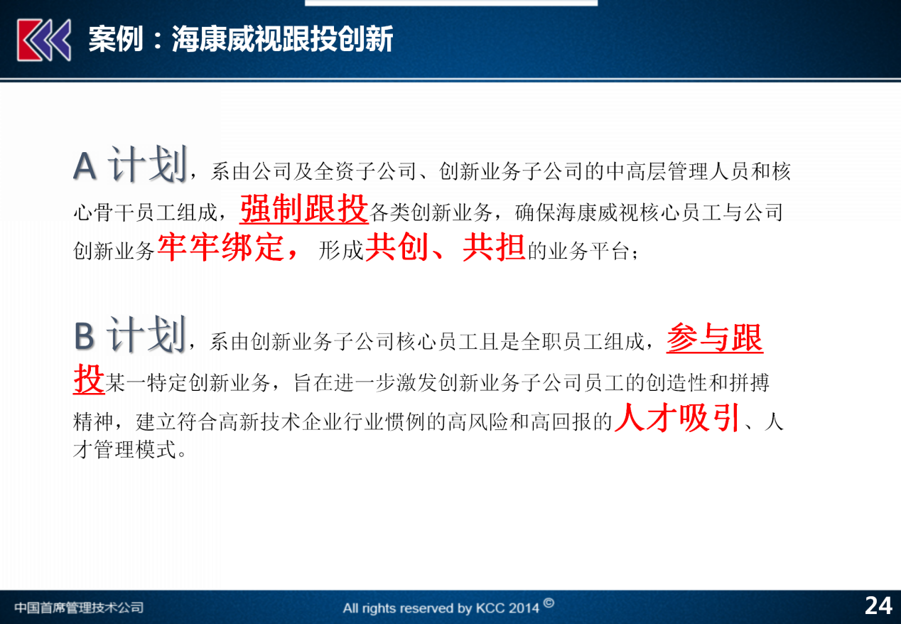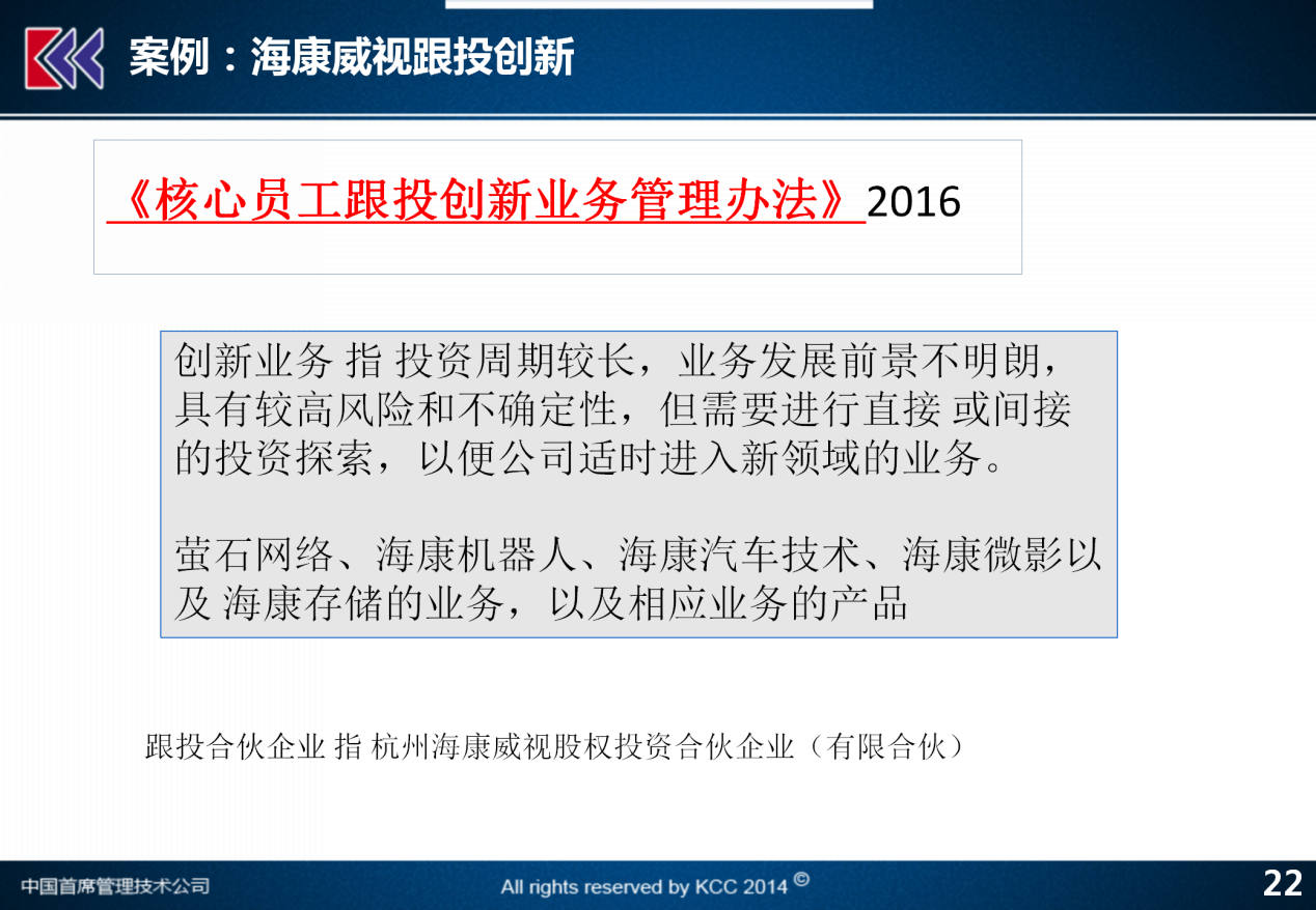 再举一个例子,讲回到海康威视。2017年,海康威视正式开始实施核心员工跟投创新业务管理办法,就在孵化期里要做的一个核心的事情,海康威视除了安防系统是他的主业核心以外,在过去的几年里面进入了一些,比如机器人、汽车、车载、微影、存储这样新的业务,对于这些新的有一定风险原先没有尝试过的业务,如何保证继续能得到有效的发展并且降低的风险,就要通过跟投。