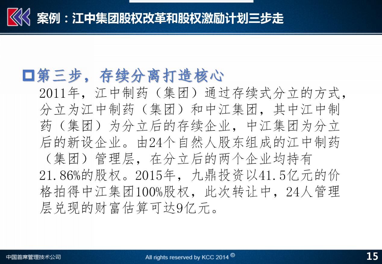 第三步,江中制药集团进行了存续核心业务分离的资产重组的尝试。那么,在把江中医药集团打造成两个集团,一个叫江中集团,一个叫中江集团,江中集团是一个存续型企业,中江集团是一个新设的崭新的面向未来的一个集团。在这两个集团当中,持股人员的激励比例都是同样的,以保证国有资本的责权利相等,同时对于这种新企业,没有包袱的企业,继续引入面向未来的更多的投资人,把九鼎投资引入进来,投入了41.5个亿,继续来打造中江集团,把这一块不断地放大。