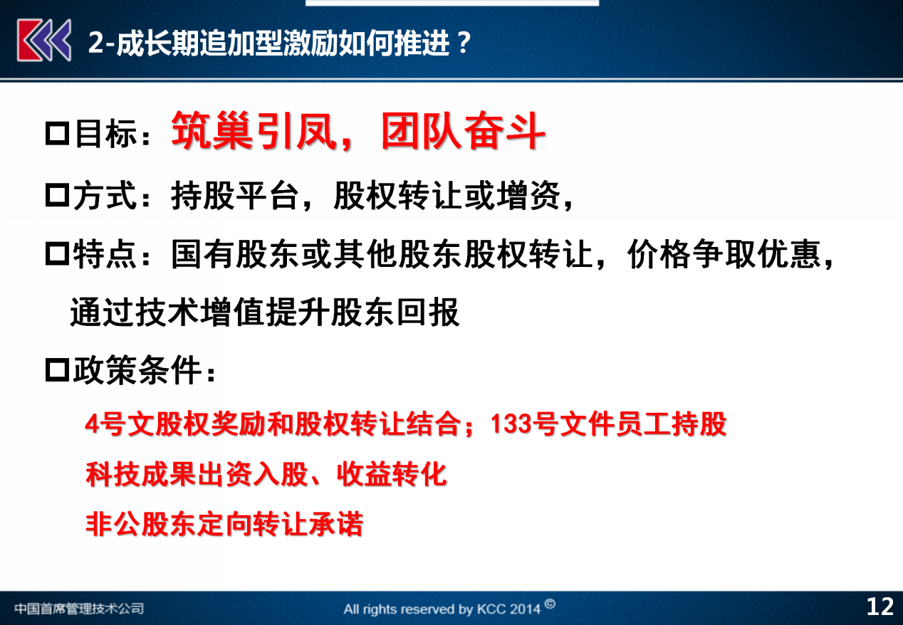 第一种,4号文提到,达到国有科技型公司条件的这些公司,要么可以采用股权奖励的模式,要么可以采用股权转让的模式,还可以采用股权奖励和股权转让相结合的方式,来做这样的工作,这就是给大家提供一个成长期追加型的一个方法。同时,133号文说混合所有制企业开展员工持股,本身也是可以允许大家通过平台增资的方式来实现股权的持有。